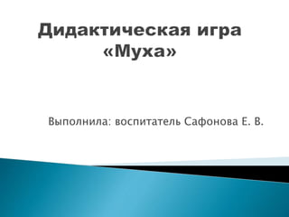 Документ описывает работу воспитателя Е.В. Сафоновой по развитию пространственных представлений у детей через игровые методики. Основная цель игр — помочь детям освоить понятия ориентации на плоскости и запомнить направления: право, лево, вверх, вниз. В качестве примеров проводимых игр приводятся различные варианты использования фишек на расчерченном поле и карточках.