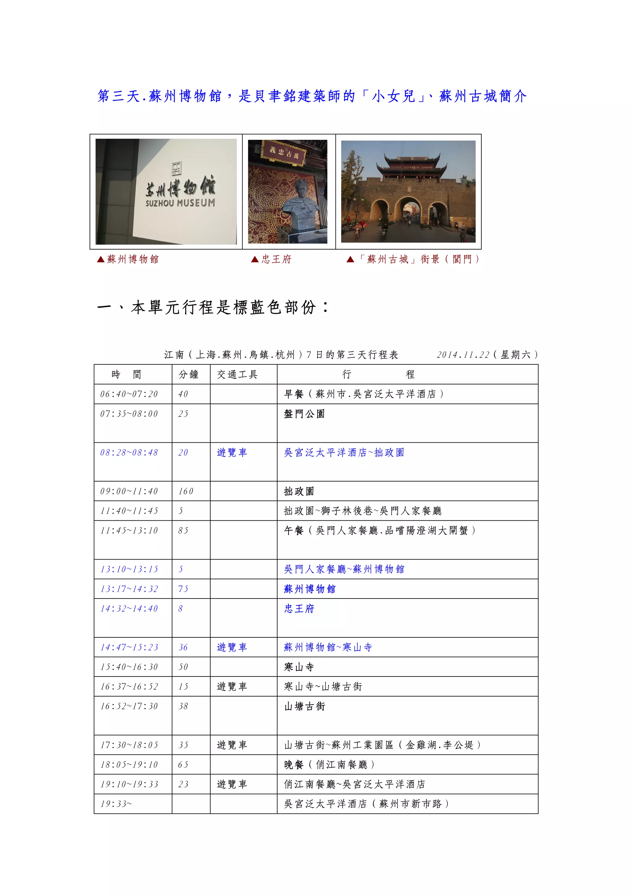 苏州博物馆,由贝聿铭设计,是此行中不可错过的景点之一,紧邻拙政园,馆藏丰富,包括两件国宝级文物。游览包括早晨的早餐、园林游、午餐和博物馆的参观,以及忠王府和寒山寺的游览。文档详细记录了2014年11月22日的行程安排及参观感受。