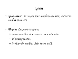 บุคคล • บุคคลธรรมดา สภาพบุคคลย่อมเริ่มแต่เมื่อคลอดแล้วอยู่รอดเป็นทารก และสิ้นสุดลงเมื่อตาย •