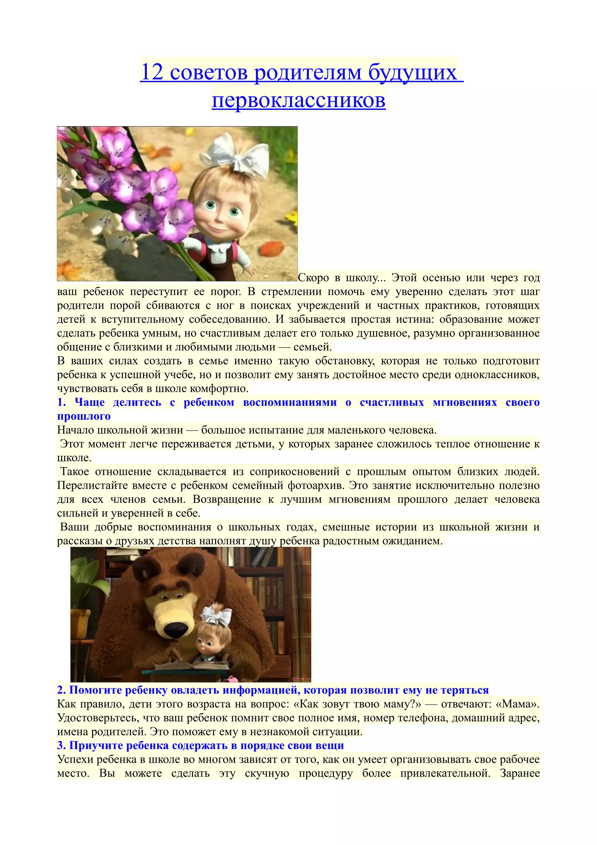 Документ содержит 12 советов для родителей, помогающих подготовить детей к началу школьной жизни. Он подчеркивает важность семейного общения и позитивного отношения к школе, а также дает рекомендации по развитию самостоятельности, уверенности и хороших манер у детей. Важно создать поддерживающую и любящую обстановку, способствующую гармоничному росту и обучению ребенка.
