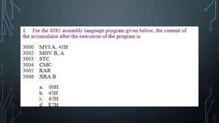 This document provides an example of programming for the 8085 microprocessor. It shows two 8-bit values A and B being XOR'd (exclusive OR operation) together, with the initial values of A and B being 45H (0100 0101 binary) for both. Performing the XOR operation on A and B results in a value of 0110 0111 binary being stored in the accumulator. The carry flag is initially set to 1 but becomes 0 after the operation.