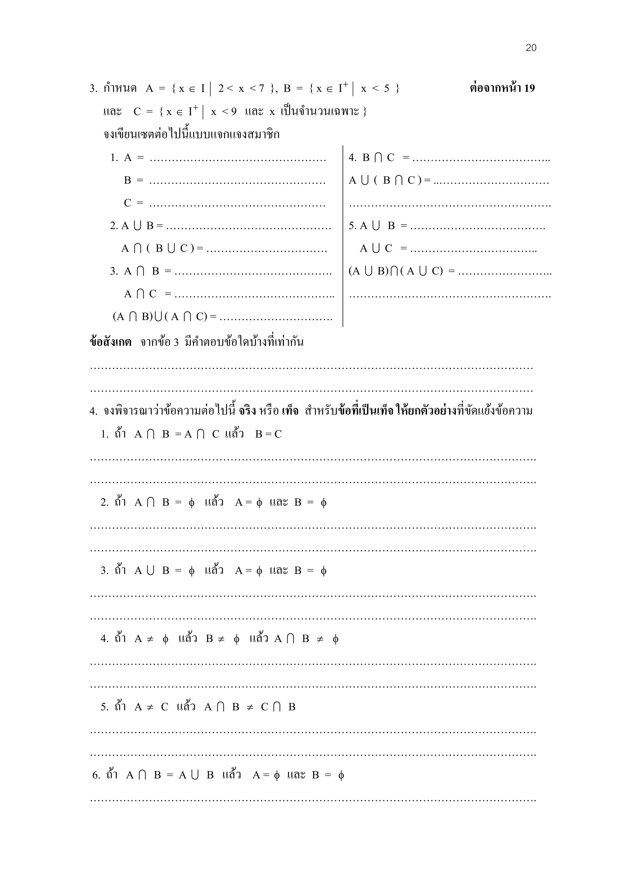 3. กาหนด A= { x I 2 < x < 7 }, B = { x I x < 5 } ต่ อจากหน้ า 19