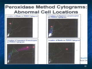 Dokumen ini membahas tentang pemeriksaan hitung jenis lekosit menggunakan berbagai metode, termasuk metode manual dan otomatis serta teknik pewarnaan dan analisis. Kegunaan klinis pemeriksaan ini adalah untuk membantu diagnosis kelainan darah seperti infeksi dan leukemia. Terdapat berbagai metode pengukuran untuk menentukan jenis dan jumlah lekosit, serta analisis morfologi yang penting dalam penilaian klinis.
