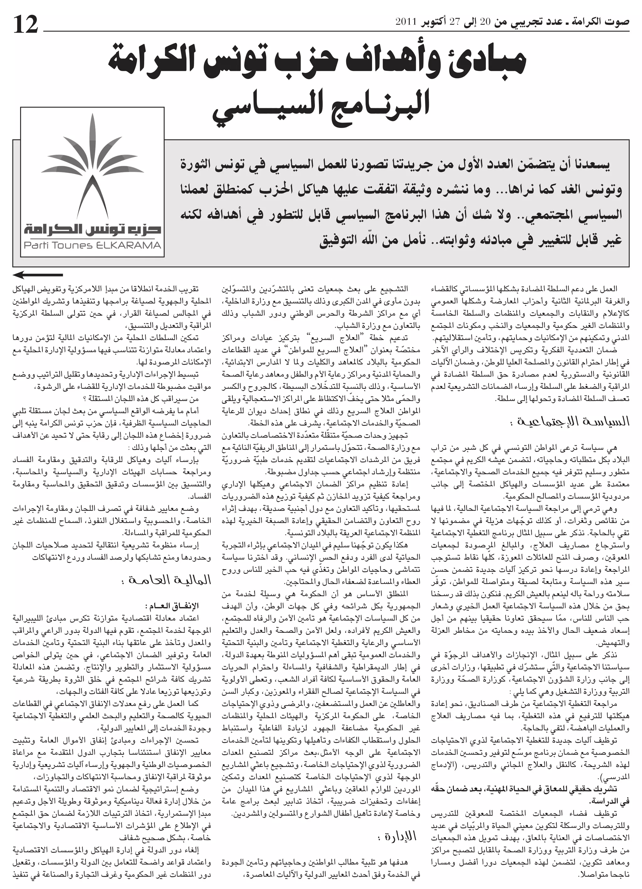 تستعرض الوثيقة البرنامج السياسي لحزب تونس الكرامة كاستجابة لاحتياجات المجتمع التونسي، وتركز على أهمية التفاعل بين السلطة المحلية والمكونات المختلفة بالمجتمع لضمان تحقيق العدالة الاجتماعية. كما تسعى إلى تحسين الخدمات الاجتماعية والصحية من خلال مراقبة وتطوير آليات العمل بحيث تضمن عدم تهميش الفئات الضعيفة ومعالجة القضايا الاجتماعية بشكل شامل.