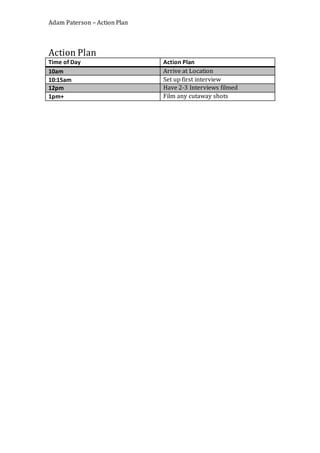 Adam Paterson has an action plan for filming interviews and cutaway shots between 10am and 1pm, which includes arriving at the location at 10am, setting up the first interview at 10:15am, having 2-3 interviews filmed between 10:15am and 12pm, and filming any additional cutaway shots after 1pm.