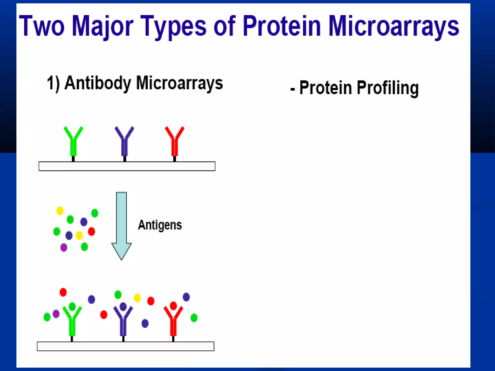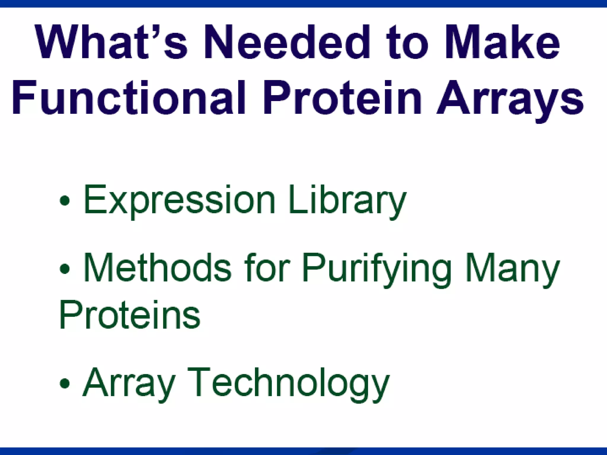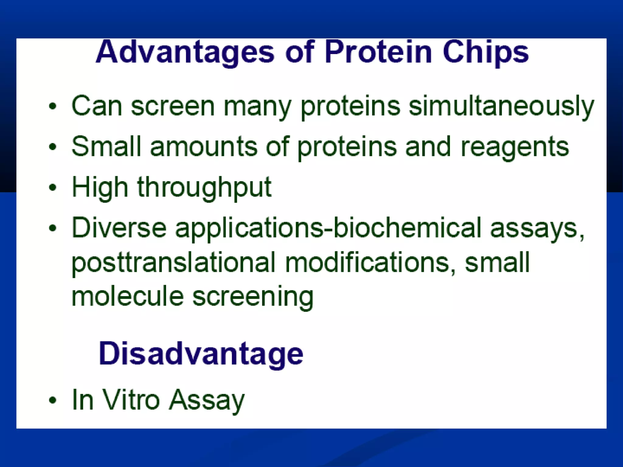 Bio-chips, also known as lab-on-a-chip devices, can provide portable, low-cost, and low-power platforms for integrating sensors and other components. DNA microarrays allow high-throughput screening by placing probes for thousands of genes on a single chip. mRNA is extracted from experimental and control samples, converted to fluorescent cDNA, and hybridized on the chip. The resulting colors indicate gene expression levels. Protein microarrays similarly attach thousands of proteins to a chip and use probes to study protein interactions, expression profiles, and biochemical functions through detection of reaction products. Technical challenges include maintaining protein activity and structure during immobilization and detection.