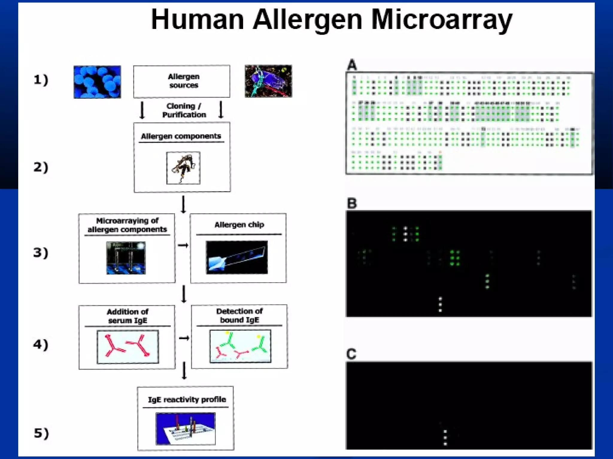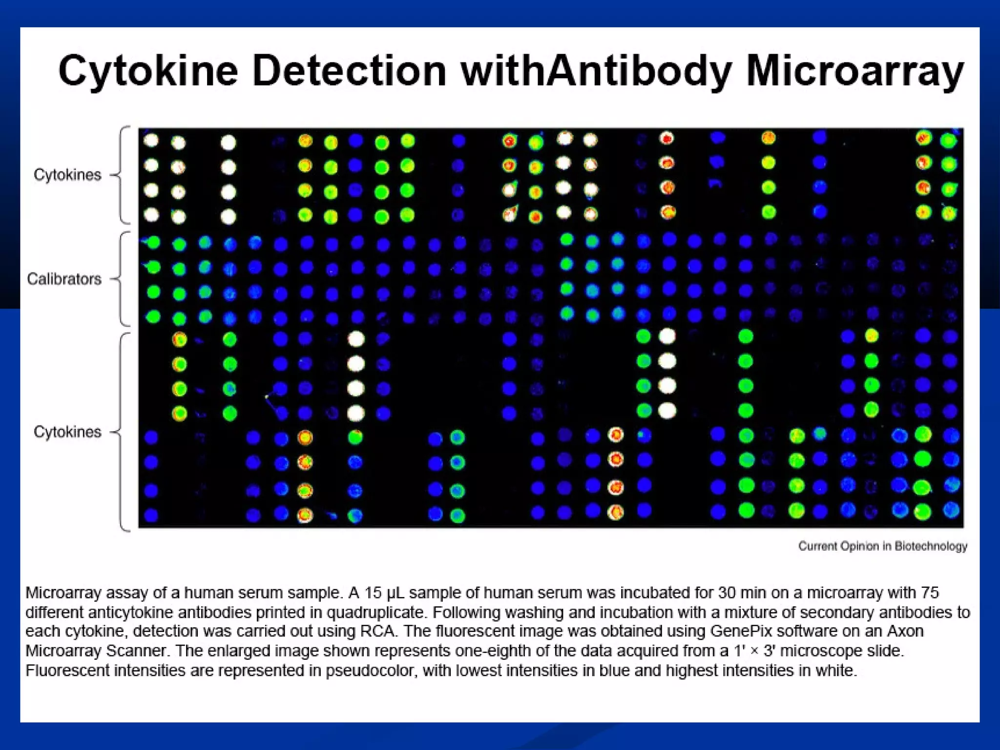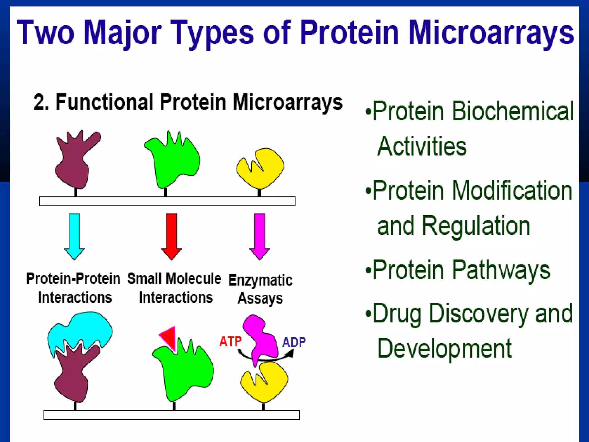 Bio-chips, also known as lab-on-a-chip devices, can provide portable, low-cost, and low-power platforms for integrating sensors and other components. DNA microarrays allow high-throughput screening by placing probes for thousands of genes on a single chip. mRNA is extracted from experimental and control samples, converted to fluorescent cDNA, and hybridized on the chip. The resulting colors indicate gene expression levels. Protein microarrays similarly attach thousands of proteins to a chip and use probes to study protein interactions, expression profiles, and biochemical functions through detection of reaction products. Technical challenges include maintaining protein activity and structure during immobilization and detection.