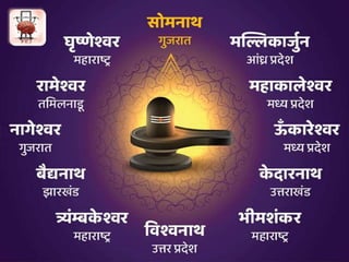क्र.स. ज्य शतशिंग क े नाम स्थान राज्य 1. स मनाथ ज्य शतश िंग वेराव , स मनाथ गुजरात 2. मस्िकाजुुन ज्य शतश िंग श्रीिै म आोंध्र प्रिेि 3. महाका ेश्वर ज्य शतश िंग उज्जैन मध्य प्रिेि 4. ओोंकारेश्वर ज्य शतश िंग खोंडवा मध्य प्रिेि 5. क े िारनाथ ज्य शतश िंग क े िारनाथ उत्तराखोंड 6 . भीमािोंकर ज्य शतश िंग पुणे महाराष्ट्र 7. शवश्वनाथ ज्य शतश िंग वाराणसी उत्तर प्रिेि 8. त्र्योंबक े श्वर ज्य शतश िंग नाशसक महाराष्ट्र 9. वैद्यनाथ ज्य शतश िंग िेवघर झारखोंड 10. नागेश्व ज्य शतश िंग द्वारका गुजरात 11. रामेश्वर ज्य शतश िंग रामेश्वरम तशम नाडु 12. घृष्णेि्वर ज्य शतश िंग औरोंगाबाि महाराष्ट्र