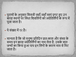  पुराण ोंक े अनुसार शिवजी जहााँ-जहााँ स्वयों प्रगट हुए उन बारह स्थान ों पर स्स्थत शिवश ोंग ों क ज्य शतश िंग ों क े रूप में पूजा जाता है।  ये सोंख्या में १२ है।  मान्यता है शक ज मनुष्य प्रशतशिन प्रात:का और सोंध्या क े समय इन बारह ज्य शतश िंग ों का नाम ेता है, उसक े सात जन् ों का शकया हुआ पाप इन श ोंग ों क े स्मरण मात्र से शमट जाता है।