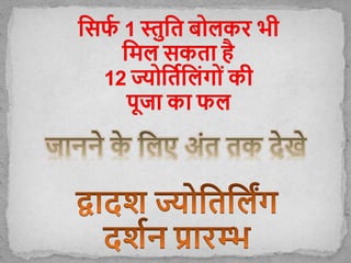 द्व दश ज्योतितलिंगस्तोत्रम् सौराष्ट्रे स मनाथों च श्रीिै े मस्िकाजुुनम्। उज्जशयन्याों महाका म ोंकारों मम ेश्वरम् ॥1॥ परल्ाों वैजनाथों च डाशकयन्याों भीमिोंकरम्। सेतुबन्धे तु रामेिों नागेिों िारुकावने ॥2॥ वारणस्ाों तु शवश्वेिों त्र्यम्बक ों गौतमी तटे। शहमा ये तु क े िारों ध्रुष्णेिों च शिवा ये ॥3॥ एताशन ज्य शतश िंगाशन सायों प्रातः पठे न्नरः। सप्तजन्क ृ तों पापों स्मरेण शवनश्यशत ॥4॥ ॥ इशत द्वािि ज्य शतश िंग स्तुशत सोंपूणुम् ॥