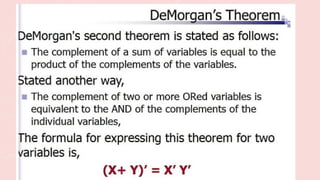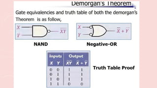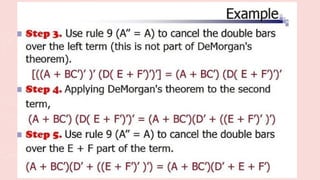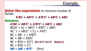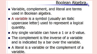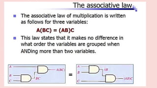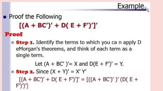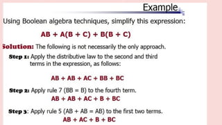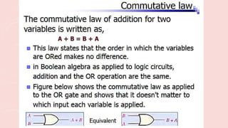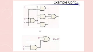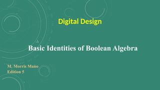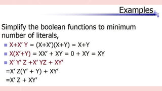 The document outlines the basic identities and principles of Boolean algebra, including commutative, associative, and distributive properties. It emphasizes the duality principle and provides simplification techniques for Boolean functions using identities. The text also illustrates how to effectively reduce the number of logic gates in digital circuits through algebraic manipulation.