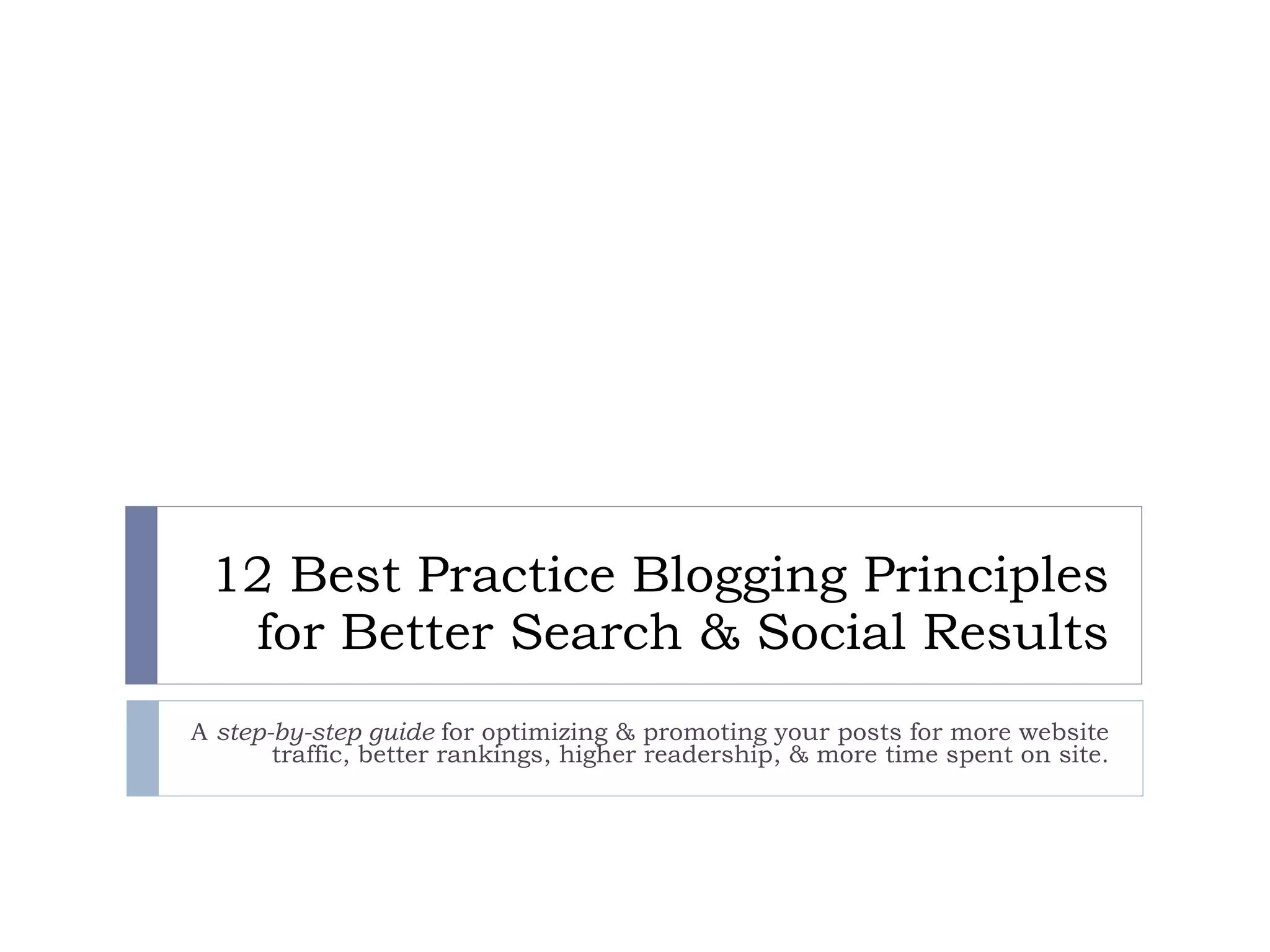 The document outlines 12 best practice blogging principles aimed at optimizing and promoting blog posts for increased website traffic and improved search rankings. It emphasizes the importance of owning your domain, conducting keyword research, and producing authoritative content, while also offering strategic tips for post planning and social media engagement. The guide is structured to help bloggers create content that establishes expertise, drives backlinks, and enhances overall readership.