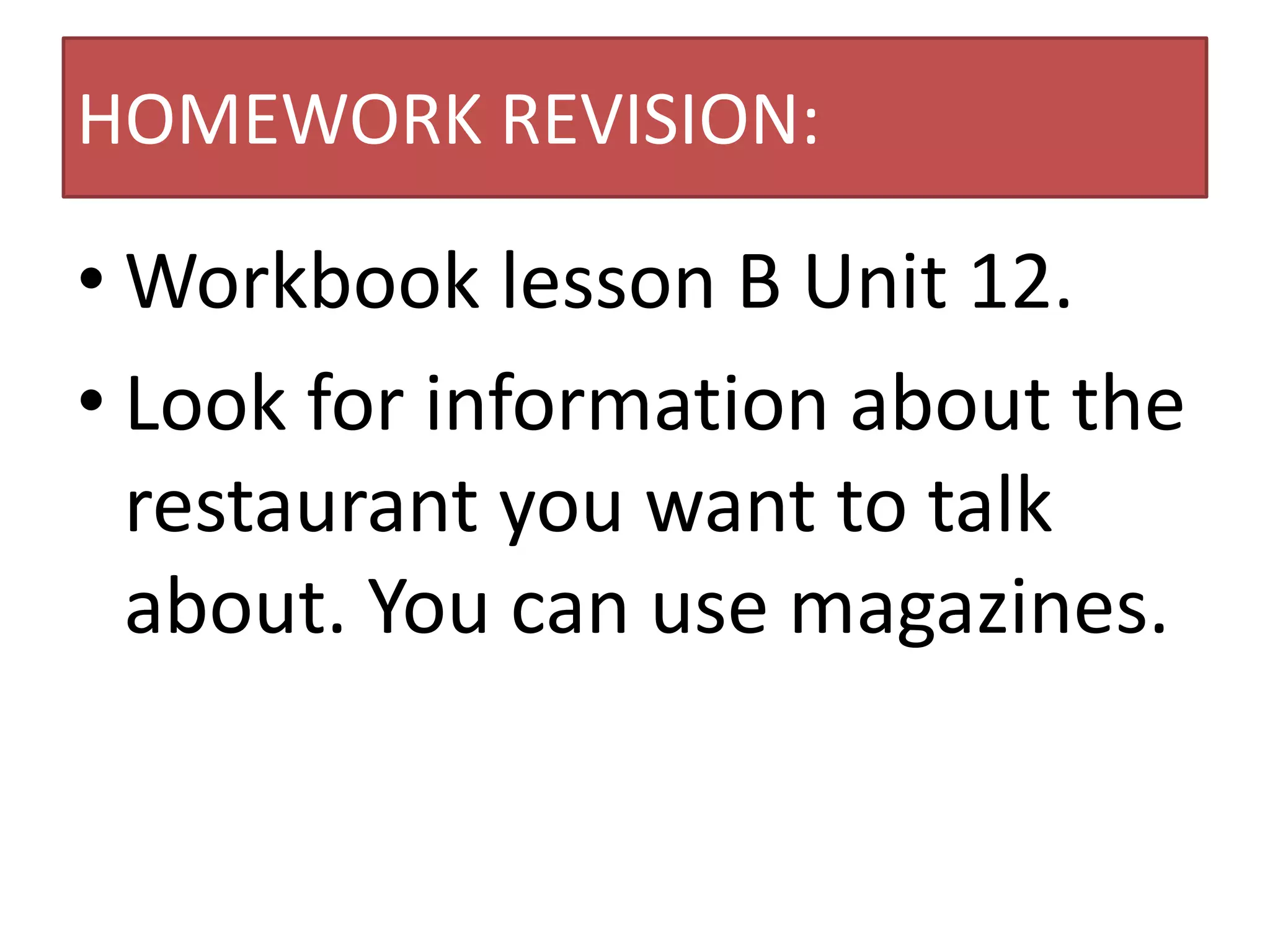 This document provides homework revision instructions for a language lesson about role-playing a visit to a restaurant. The objectives are to role-play a conversation selecting a restaurant, reviewing phrases like "would like" and verb tenses, and using vague language instead of lists. Students should expand one conversation, ask and answer questions, and show attention by role-playing conversations before and during a restaurant visit, taking turns playing the server.
