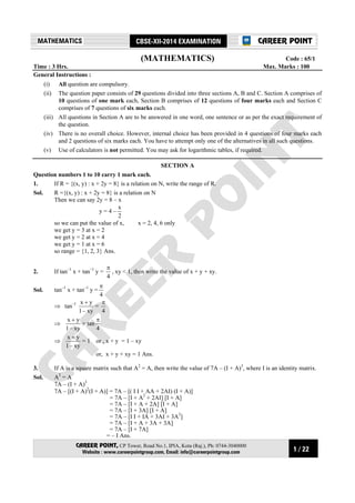 The document contains instructions for a mathematics exam consisting of 3 sections (A, B, C). Section A has 10 1-mark questions. Section B has 12 4-mark questions. Section C has 7 6-mark questions. Calculators are not permitted. Questions can have either internal choice or no choice. The document provides 10 sample 1-mark questions from Section A to illustrate the format and difficulty level.