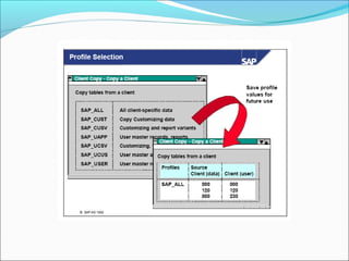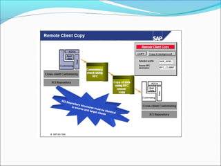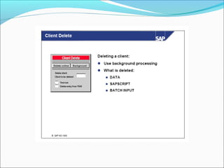 This document outlines 10 different client copy functions: SCC1-SCC9 and SCCL. These functions include special client copy selections, client transport, client copy logs, client administration, client deletion, client import, client import post processing, client export, remote client copy, and local client copy.