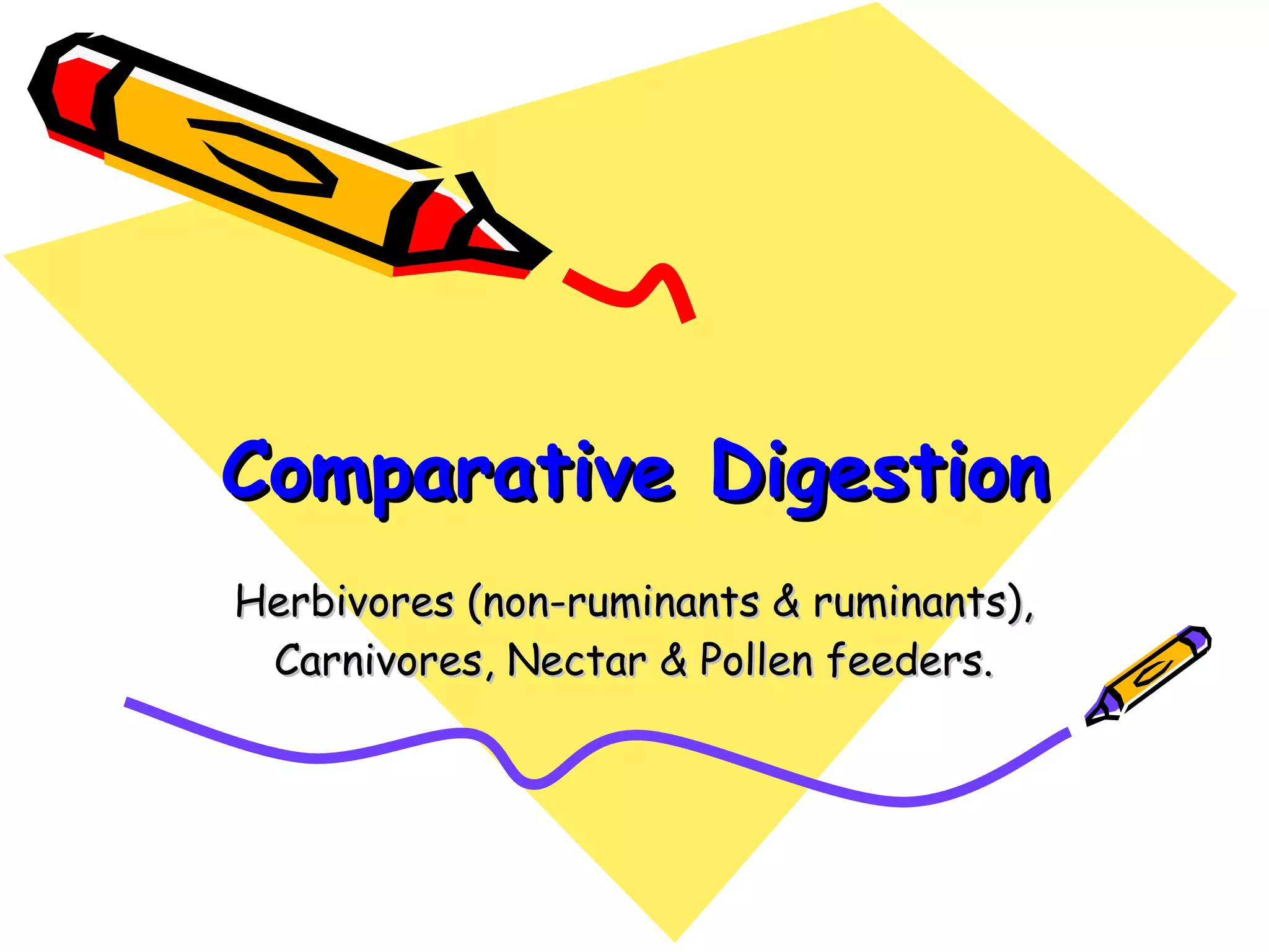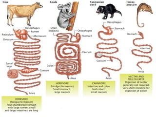 The document summarizes different types of digestive systems among herbivores and other animals. It divides herbivores into two categories: hindgut fermenters like non-ruminants which have long intestines containing bacteria to aid digestion, and foregut fermenters like ruminants which have an enlarged rumen in the stomach to break down plant matter. Ruminants digest food through a two-step process of chewing, swallowing, and then regurgitating food to be re-chewed before full digestion.