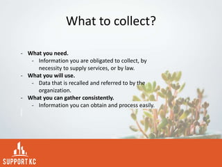 This document provides tips for collecting and storing data. It recommends collecting data that is needed, will be used, and can be gathered consistently. Specific types of data are recommended such as contact information, donation details, and information required by law or grants. Data should be stored securely and consistently using standardized formats and unique identifiers. Notes fields can capture any uncertainties or questions about the data. Address formats and validation are also discussed.