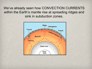 Convection currents in the atmosphere and oceans, wind patterns, and ocean currents work together to distribute heat throughout the Earth system and prevent large temperature differences between the polar and equatorial regions. Warm air and water rises at the equator, travels poleward and cools before sinking and returning to the equator, while global wind patterns and ocean currents help spread the warmth across the planet.