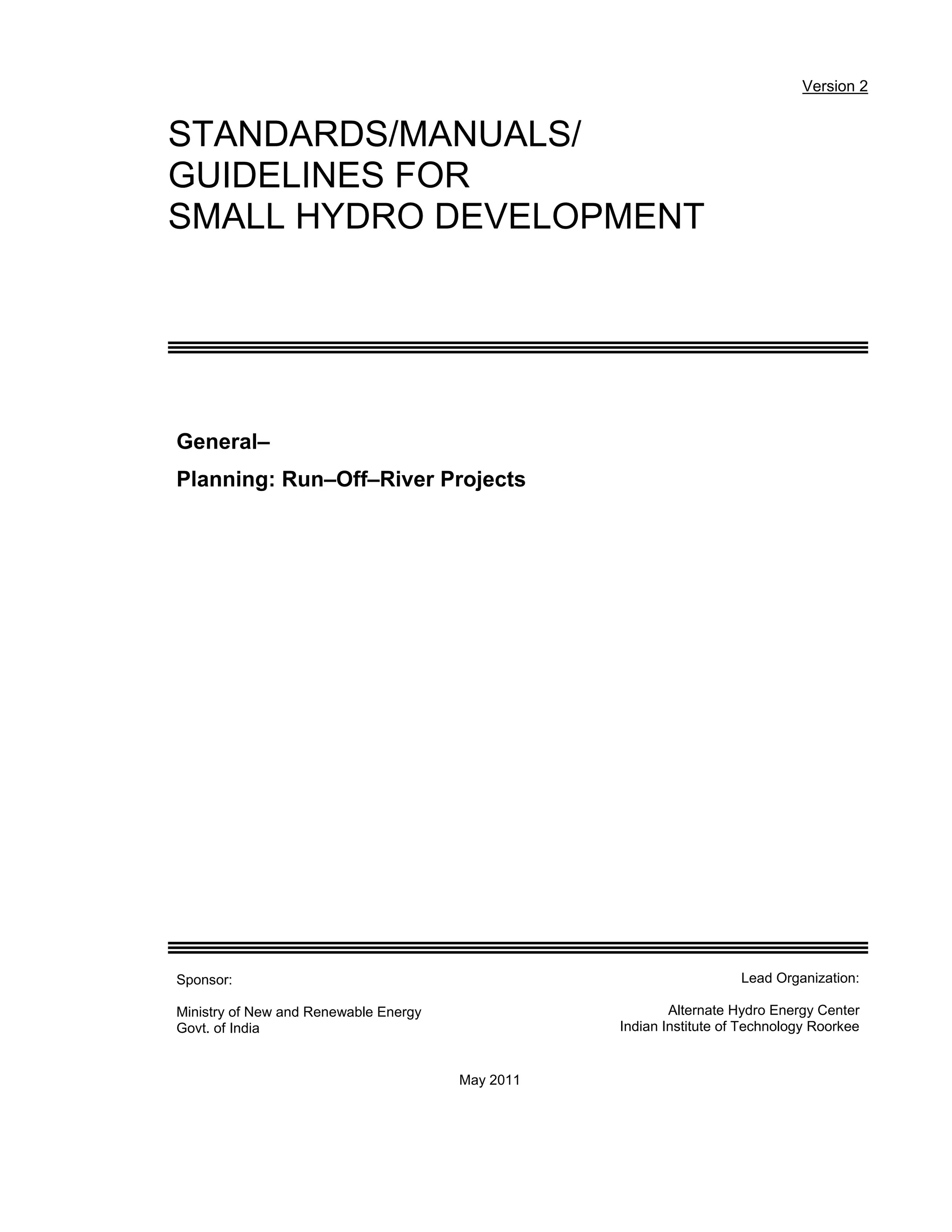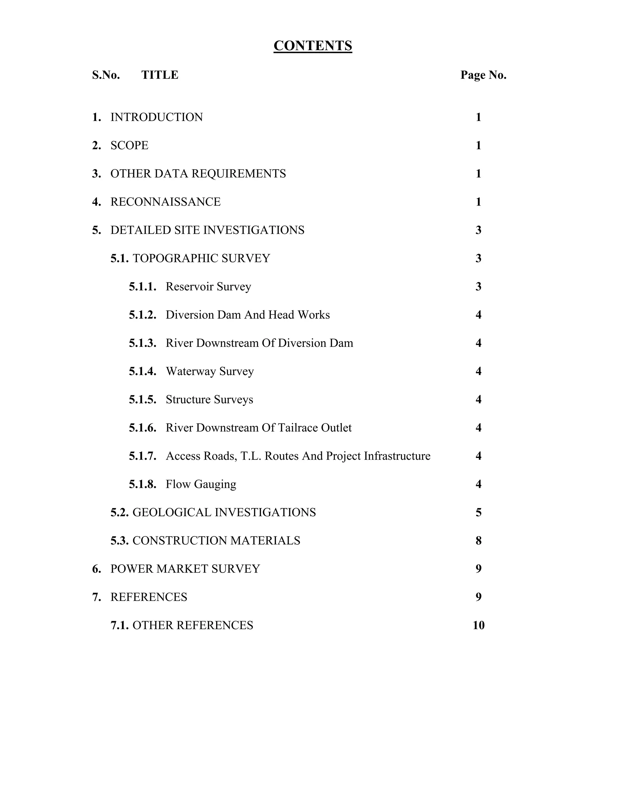 This document provides guidelines for planning site reconnaissance and detailed field investigations for small hydroelectric projects. It recommends establishing a survey control network and conducting topographic surveys, geological investigations, and materials searches. Topographic surveys should map reservoirs, structures, waterways, and infrastructure. Geological investigations should identify subsurface conditions through test pits, trenches, and samples. These investigations provide essential data for design and cost estimates.