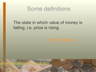 1. Inflation refers to a general and widespread increase in the price level of goods and services in an economy over time. It can be caused by too much money chasing too few goods.