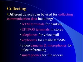 Collecting communication data involves using various devices like ATM terminals, phones, keyboards, cameras, and smartphones. The data is then processed by encoding it for transmission and decoding it at the other end. There are four types of encoding and decoding: analog to analog, digital to digital, analog to digital, and digital to analog. Client-server architecture describes the relationship between client software that requests information and server software that responds with the requested information.