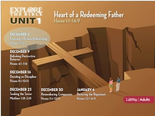 The document explores the themes of broken relationships found in the book of Hosea, highlighting God's love for Israel despite their unfaithfulness. It discusses the metaphors of promiscuity and redemption, showing how God's call for repentance leads to eventual restoration. The lessons drawn emphasize the cost of redemption and the importance of true commitment in relationships.