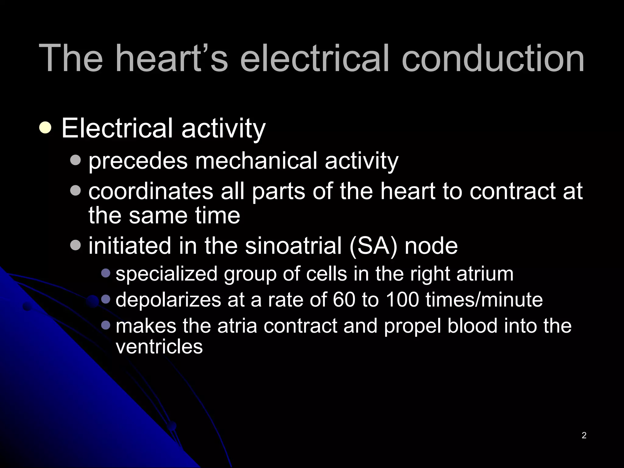 The 12-lead ECG provides important information about the heart's electrical activity. It begins with atrial depolarization seen as the P wave, followed by ventricular depolarization in the QRS complex. The ST segment and T wave represent ventricular repolarization. Each of the 12 leads views the heart from a different angle, with the standard limb leads in the frontal plane and the chest leads in the horizontal plane. Together they allow clinicians to determine the heart's rate, rhythm, and axis.