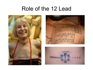 The 12-lead ECG is a diagnostic test that helps identify conditions like acute coronary syndrome and myocardial infarction. Obtaining a 12-lead ECG in the field is important to identify ST elevations that could indicate a heart attack and speed up treatment times. The placement of the ECG leads and the patterns in the complexes can provide clues to determine the type and location of any heart issues. It is important for paramedics to become proficient in performing and interpreting 12-lead ECGs to help ensure the best outcomes for patients experiencing potential cardiac events.