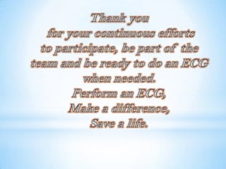 A 12-lead electrocardiogram (ECG) provides crucial information regarding the heart's electrical system and is commonly used for diagnosing acute coronary syndromes and dysrhythmias. Proper lead placement, preparation of the skin, and the patient's positioning are essential for accurate readings, along with immediate reporting of critical values observed in the ECG. The document highlights guidelines for conducting a 12-lead ECG, including electrode placement and maintenance, as well as the significance of timely and precise recording for patient care.