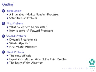 The document discusses the application of Hidden Markov Models (HMM) in machine learning for data mining, detailing Markov random processes, the calculation of transition probabilities, and the establishment of a transition model. It outlines essential algorithms like the forward procedure, Viterbi algorithm, and Baum-Welch algorithm for computation. The document provides a comprehensive introduction to HMM, its components, and methods for finding stationary distributions.