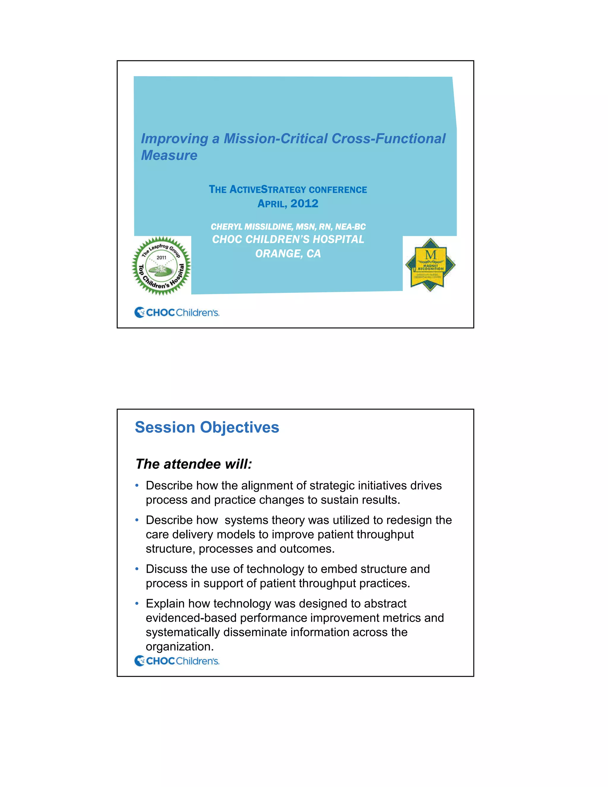 CHOC Children's Hospital implemented an interdisciplinary Patient Flow Improvement Team to address issues with patient throughput and capacity. The team developed technology-enabled solutions across the continuum of care from pre-admission to discharge. This included an electronic bed board, standardized admission processes, and automated discharge workflows. Data from the systems showed improvements such as a 27% increase in ED admissions, 76-80% faster discharge times, and an 81% reduction in cancelled admissions. The initiatives helped align practices with strategic goals of ensuring timely access to care.