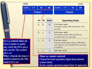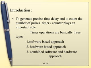 The document discusses different approaches to using timers/counters in 8051 microcontrollers. It describes software-based, hardware-based, and combined approaches. It provides details on registers used for timers like TH0, TL0, TMOD, and TCON. It explains how to use these registers to initialize and control timers, and provides examples of generating square waves using timers.