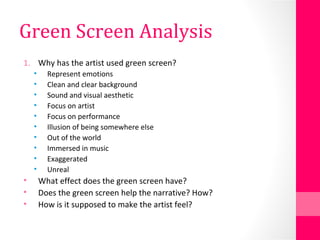 Producers use green screen in music videos to focus attention on the artist and their performance by providing a clean, clear background that allows the artist to appear as if they are somewhere else through visual effects. The green screen creates an unreal or exaggerated setting that helps represent the artist's emotions and immerses viewers in the music by enhancing the narrative and aesthetic experience.