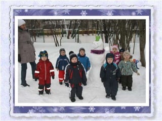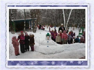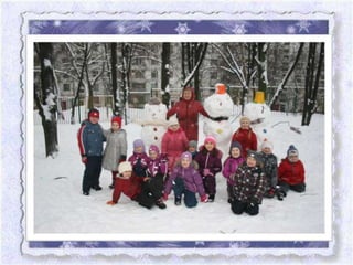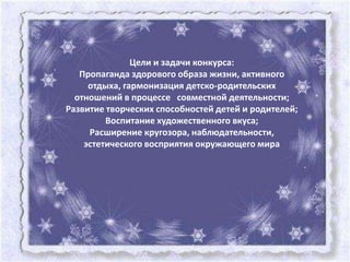 Документ описывает семейный фотоконкурс «Наш снеговик», организованный детским садом No 26 в Москве, с целью развития творческих способностей детей и гармонизации отношений в семье. Участники конкурса представили разнообразные снеговиков, созданных совместно с родителями, что способствовало укреплению детско-родительских связей. В тексте также упоминаются различные группы детского сада и их уникальные снеговики, а также благодарности участникам за активное участие.