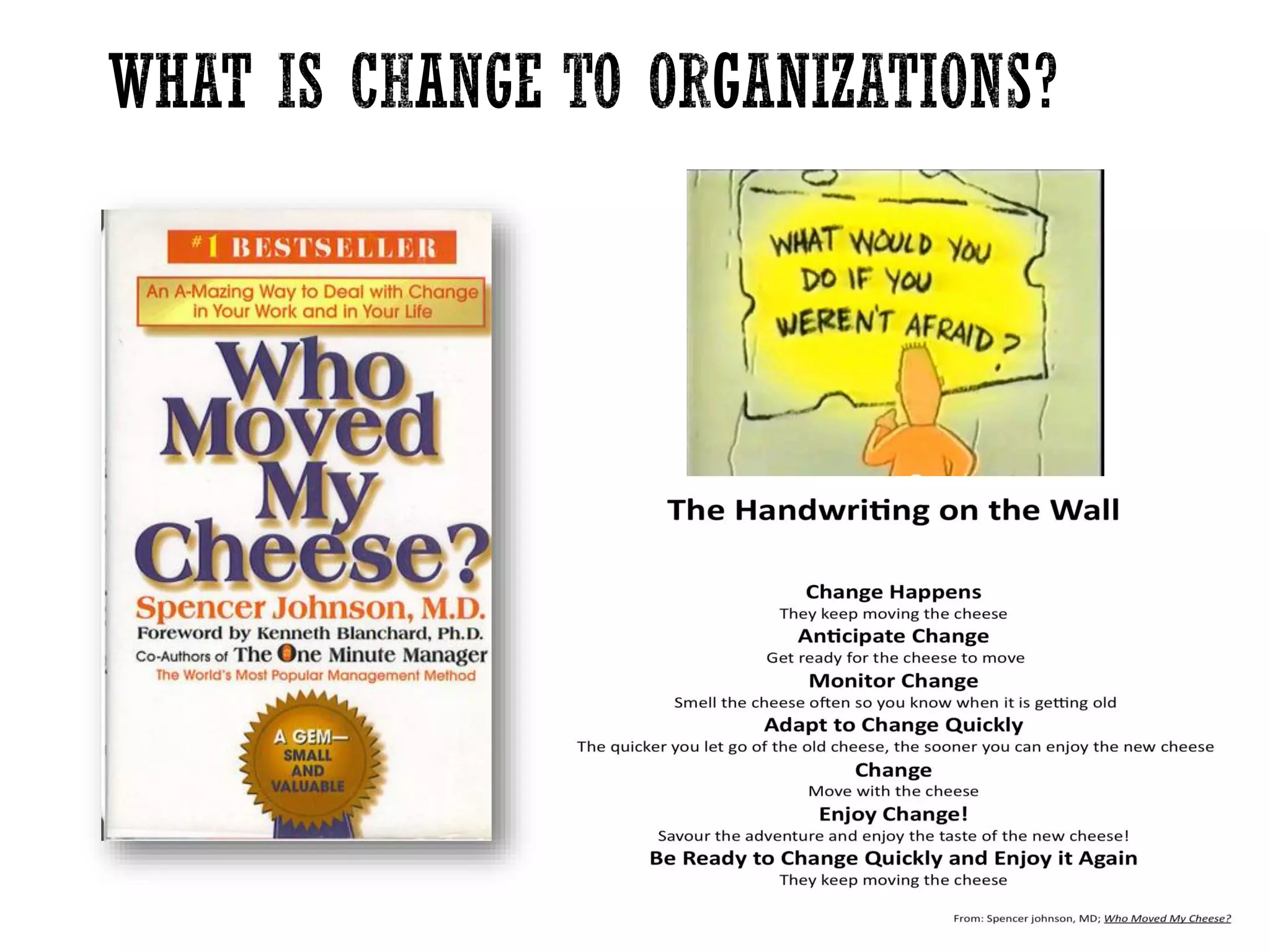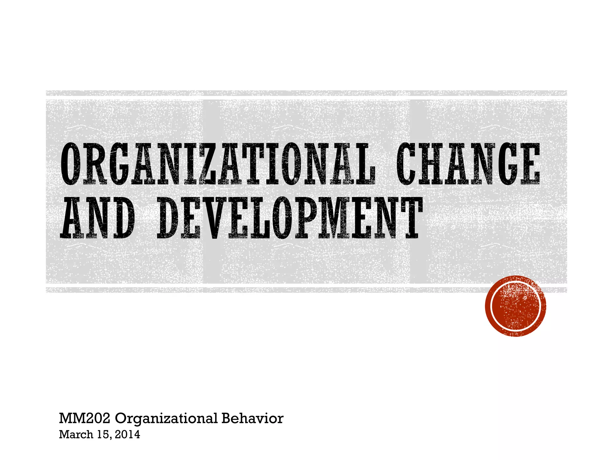 This document discusses organizational change and managing resistance to change. It provides an overview of different types of organizational changes, models of change management, sources of resistance to change, and approaches for addressing resistance. Specifically, it distinguishes between first and second order changes, describes Lewin's three-step change model and Kotter's eight steps for leading change. It also outlines forces for and responses to change, and interventions for bringing about change like structural, task-technology and people-focused approaches.