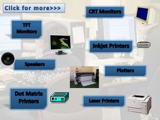 CRT monitors use electron guns to shoot electrons at phosphor particles to display an image, but they are heavy, emit radiation, and cause eye strain. TFT monitors use thin film transistors and liquid crystals to display each pixel and are lighter and cause less eye strain. Laser printers use toner and an electrically charged drum to produce high-quality, fast outputs while inkjet printers produce high-quality color prints but are slower. Dot matrix printers use pins and ink ribbons for noisy, multi-copy printing. Plotters can produce large, high-quality graphics and blueprints using pens or inkjets. Speakers output sound files from computers.