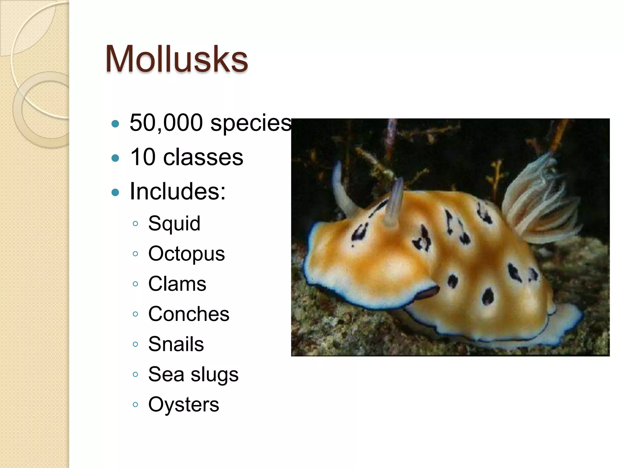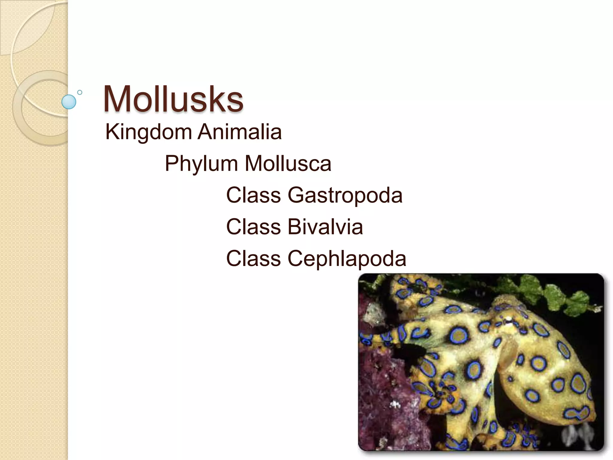 Mollusks are a diverse phylum with over 50,000 species across 10 classes. They include squid, octopus, clams, snails, and oysters. Mollusks have a mantle, foot, and radula as basic anatomical structures. The foot is adapted for movement and the mantle circulates water and secretes shells. Gastropoda includes snails and slugs with a radula and sometimes a shell. Bivalvia includes clams and oysters with two hinged shells and siphons. Cephalopoda are advanced mollusks like squid and octopus with specialized features for swimming including fins or jet propulsion.