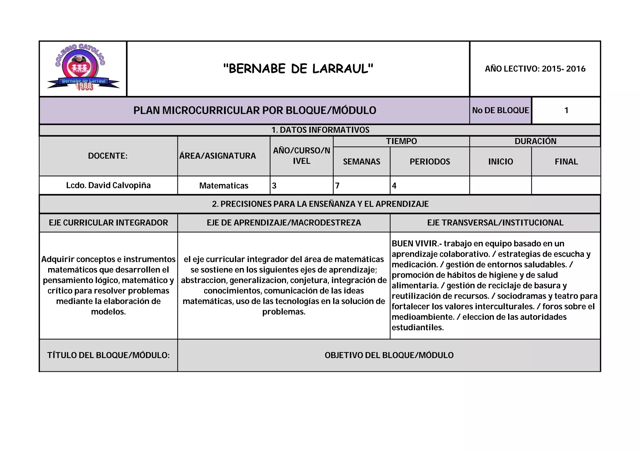 PLAN MICROCURRICULAR POR BLOQUE/MÓDULO No DE BLOQUE 1