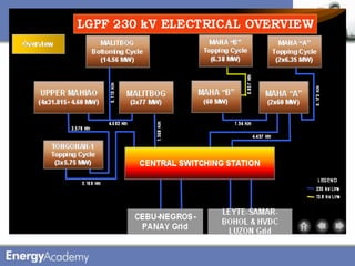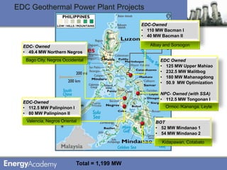 This document provides information on multiple power plants owned and operated by EDC in the Philippines. It lists the name, location, generation capacity and type of several geothermal power plants with a total capacity of 1,199 MW. Technical details are also given for some of the larger power plants, including Upper Mahiao, Malitbog, and Mahanagdong A & B, describing the turbine and generator configurations, steam parameters, cooling systems and other key facilities. Process diagrams illustrate the steam cycles used at these plants.