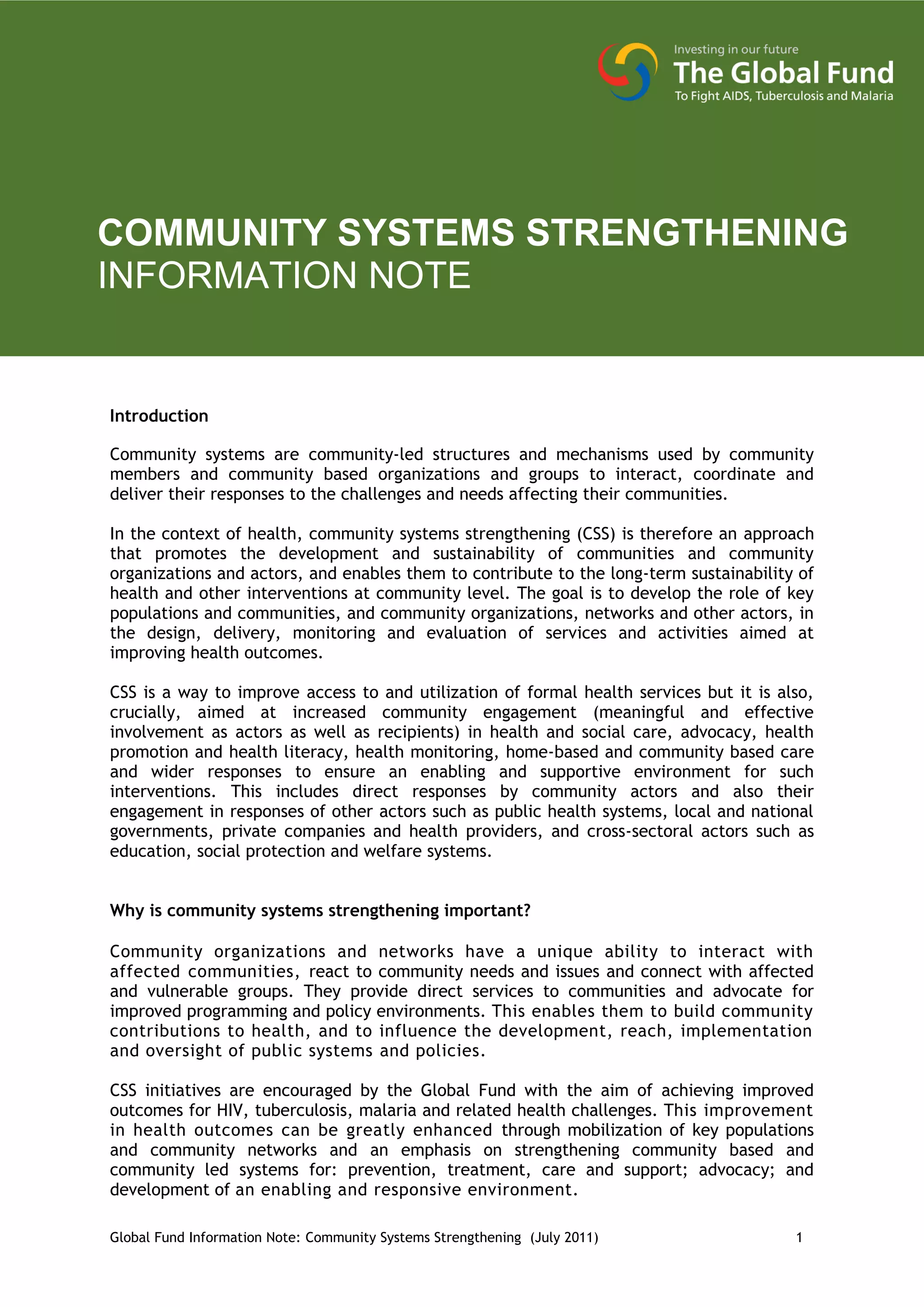This document discusses community systems strengthening (CSS), which promotes the development and sustainability of communities and community organizations to contribute to long-term health outcomes. CSS aims to improve access to and utilization of health services through increased community engagement in areas like advocacy, health promotion, and home-based care. For communities to effectively impact health, they must have strong, sustainable systems for activities, services, and funding. The core components of CSS systems include enabling environments, community networks, resources and capacity building, community activities, organizational strengthening, and monitoring and evaluation.