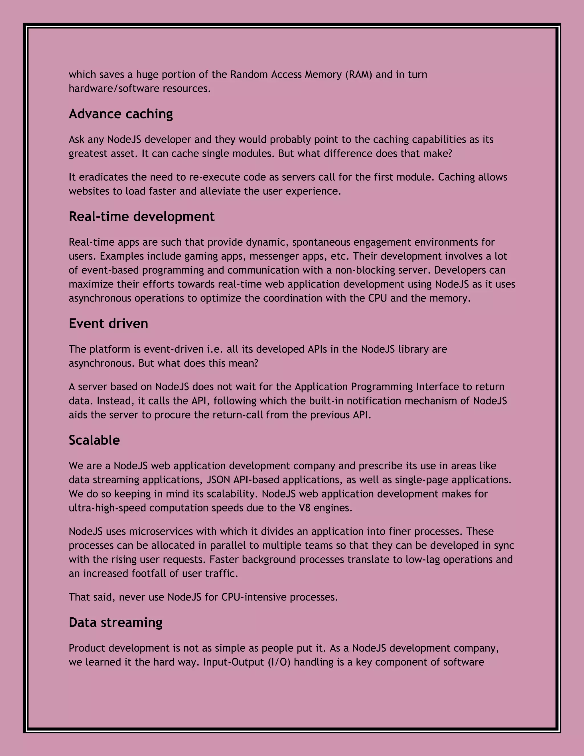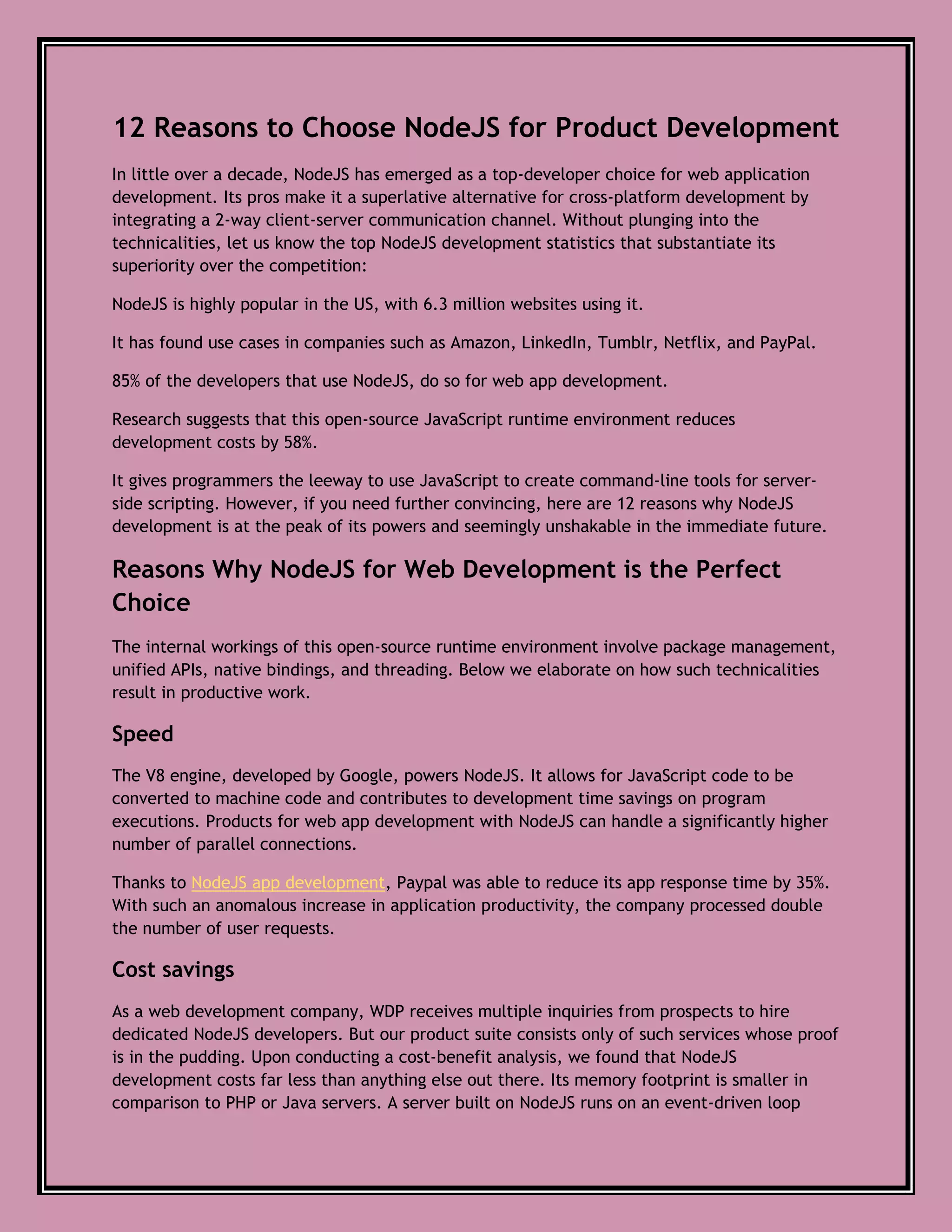 Node.js has gained popularity for web application development, with over 6.3 million websites using it, including major companies like Amazon and Netflix. Its advantages include reduced development costs, faster application response times, real-time capabilities, scalability through microservices, and strong community support. As a cost-effective open-source solution, Node.js is recommended for various projects, including single-page and conventional web applications.