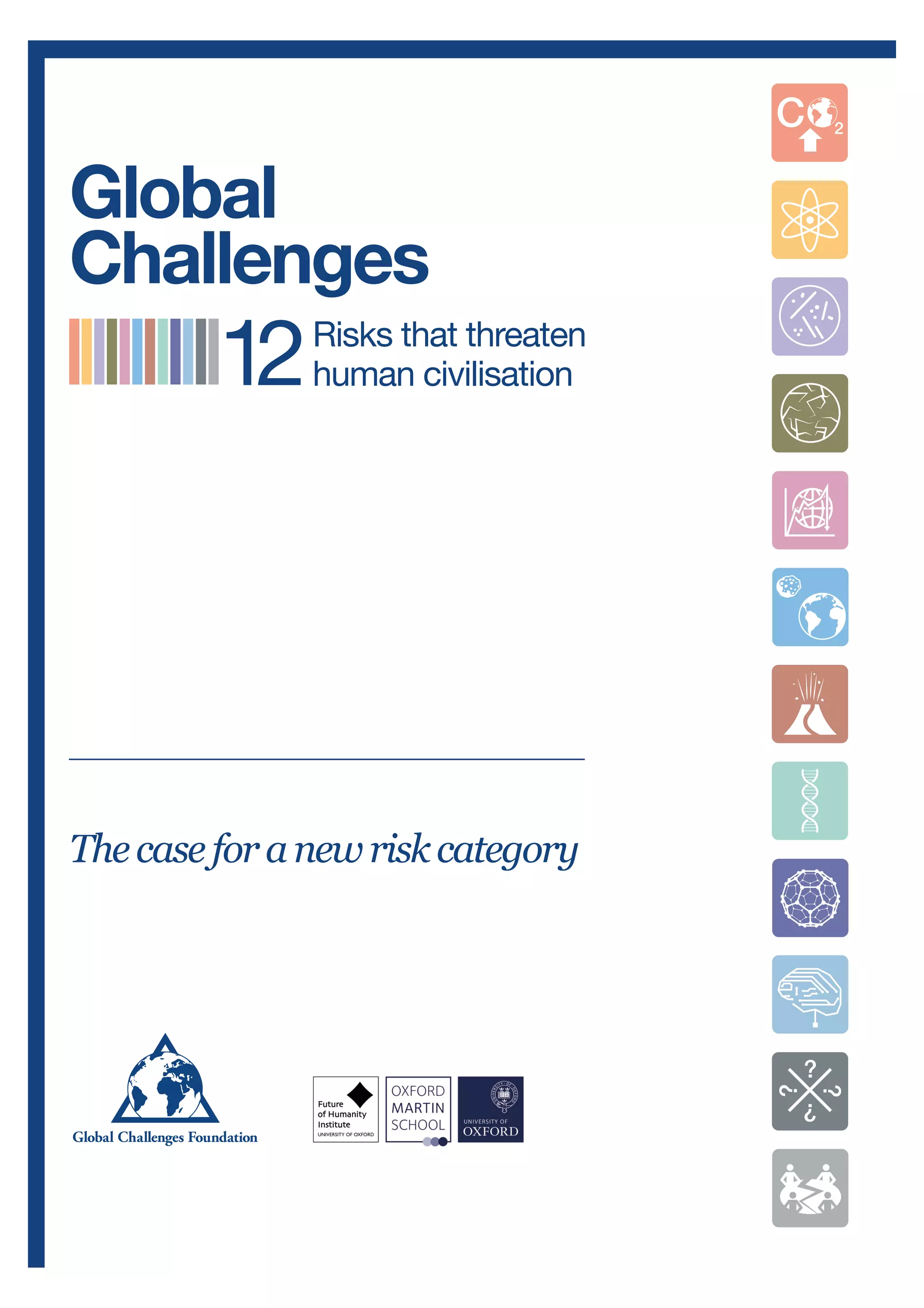 This document identifies 12 global risks that could threaten human civilization: extreme climate change, nuclear war, ecological catastrophe, global pandemic, global system collapse, major asteroid impact, supervolcanic eruption, synthetic biology, artificial intelligence, future bad global governance, unknown consequences, and nuclear nanotechnology. It argues that these risks warrant classification as a new category with "infinite impacts" due to their potential to damage human civilization beyond recovery. The report outlines the methodology used to identify these 12 risks, which involved a scientific literature review, reviewing other organizations' work in this area, and expert workshops. It then provides a chapter on each risk with more details.