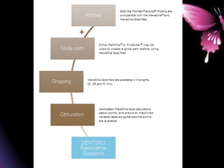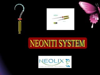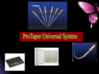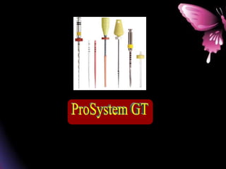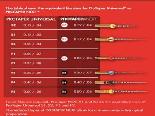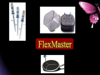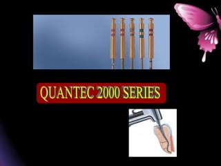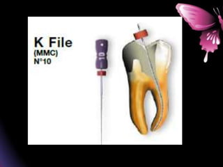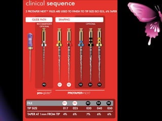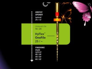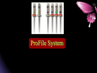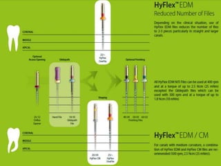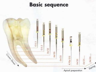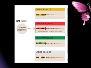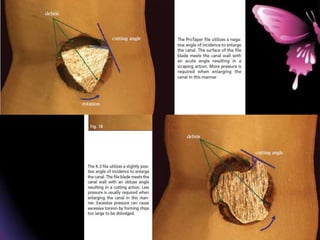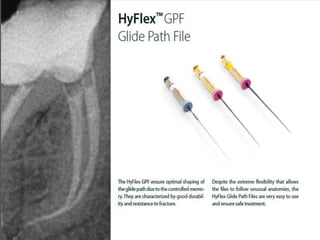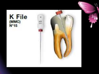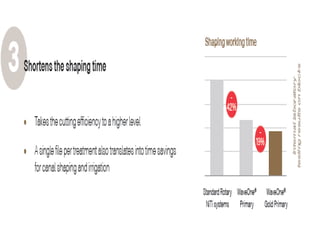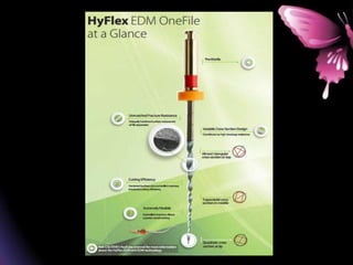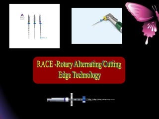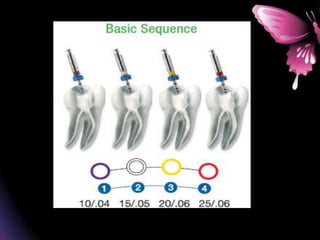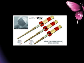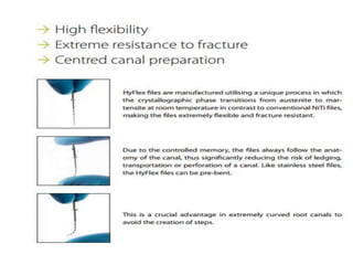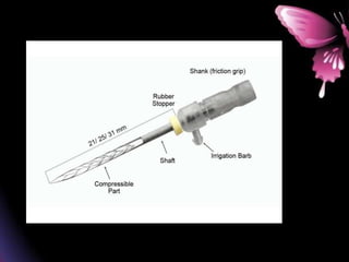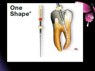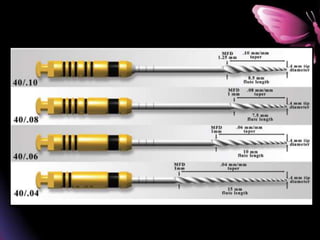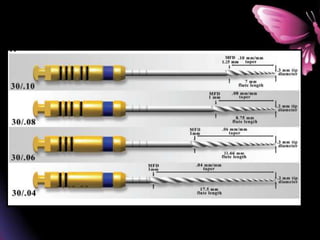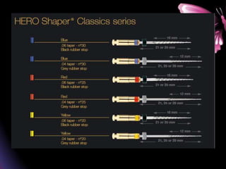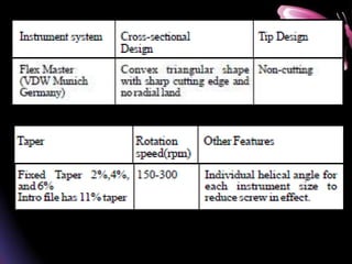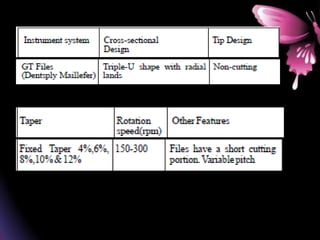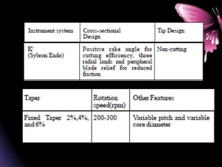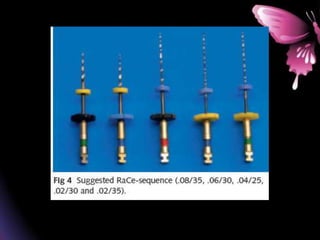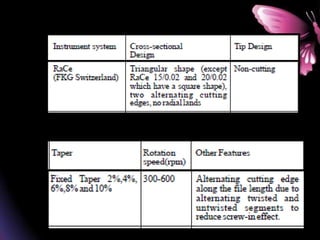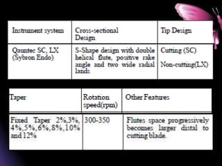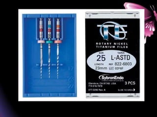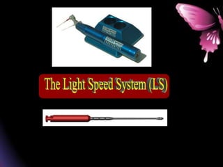 This document provides a summary of rotary instruments used in endodontics, focusing on nickel titanium (NiTi) instruments. It discusses the history and development of rotary instruments, the properties of NiTi alloy, components and design features of rotary files, and several rotary systems including LightSpeed. Key points include: NiTi files provide improved flexibility and shapeability compared to stainless steel; components include the tip, taper, rake angle, radial lands, and flutes; and systems like LightSpeed are taperless with short cutting heads for improved negotiation of curvatures.