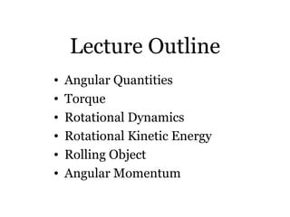 The document discusses rotational motion and angular quantities. It defines angular displacement, velocity, and acceleration and describes how they relate to linear motion. It discusses torque as the product of force and lever arm that produces rotational acceleration. The moment of inertia depends on an object's mass distribution and axis of rotation, and determines the rotational acceleration produced by a torque. Rotational kinetic energy is defined analogously to linear kinetic energy, using angular quantities rather than linear ones.
