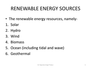 The document discusses various renewable energy sources and solar energy technologies. It provides details about six different applications of solar energy: solar water heating, solar space heating, air conditioning, solar refrigeration, solar drying, and solar cooking. For each application, it describes the basic process and components involved. It also includes diagrams to illustrate how some of the solar energy technologies work, such as solar water heating systems and solar air conditioning.