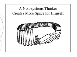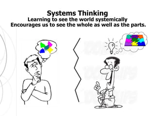 The document discusses systems thinking and its application in understanding complex systems, including the distinction between linear and network systems. It emphasizes the importance of feedback loops, nested hierarchies, resilience, and stability in systems analysis, highlighting how interconnected elements can influence overall behavior and outcomes. Additionally, the document illustrates concepts through examples like Rani's tale of rice and feedback mechanisms within ecosystems and businesses.