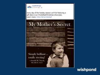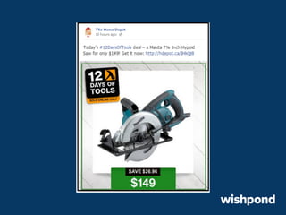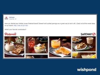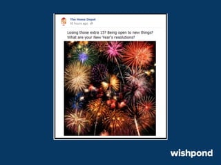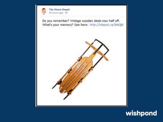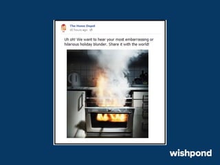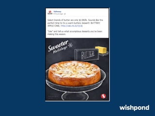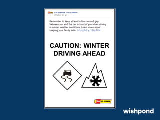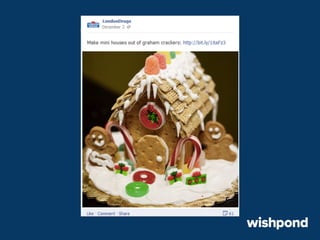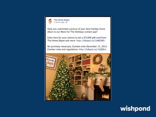 The document provides 12 tips for creating engaging holiday Facebook posts, emphasizing the importance of humor, nostalgia, and participatory content. Recommendations include using recipes, contests, gift ideas, and crafting tips to encourage interaction. It also suggests leveraging popular hashtags and winter safety tips to build trust and enhance brand awareness during the festive season.