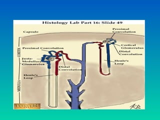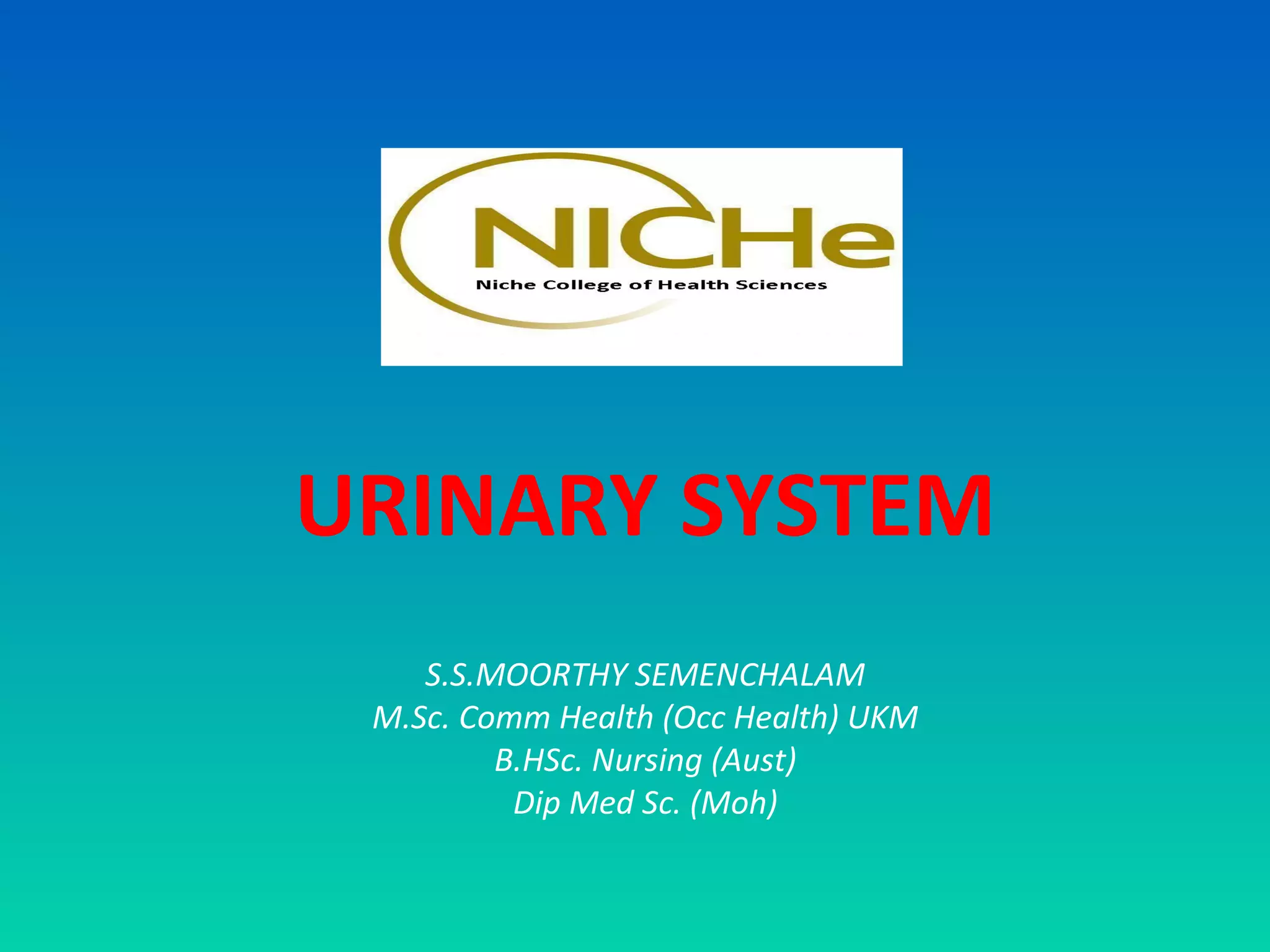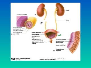 The urinary system consists of the kidneys, ureters, urinary bladder, and urethra. The kidneys filter waste from the blood to form urine. Each kidney contains over 1 million nephrons, the basic functional units that filter blood and form urine. Urine travels from the kidneys through the ureters to the urinary bladder, where it is stored until micturition. During micturition, muscles contract to expel urine through the urethra and out of the body. Precise regulation of urine production, composition, and excretion helps maintain fluid and electrolyte balance in the body.