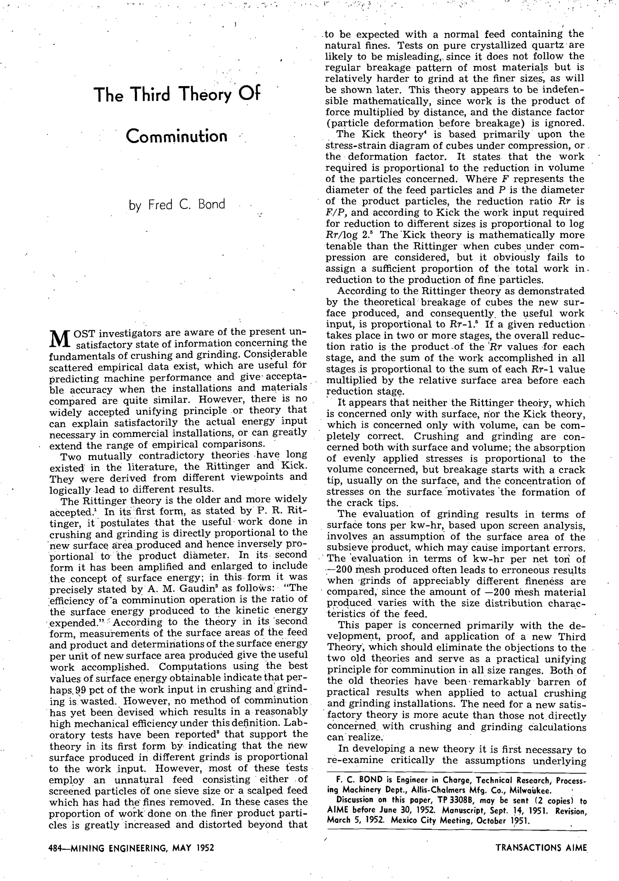 This document introduces a new "Third Theory" of comminution (crushing and grinding) that aims to address the shortcomings of existing theories. It summarizes the two existing theories - Rittinger theory focuses on surface area while Kick theory focuses on volume reduction. Neither fully explains comminution behavior. The new Third Theory proposes that the work input required is inversely proportional to the square root of the product particle diameter, taking into account both surface area and volume factors. It is presented as an improvement that could provide consistent results across all comminution operations on all materials. The theory and its implications are discussed in detail.