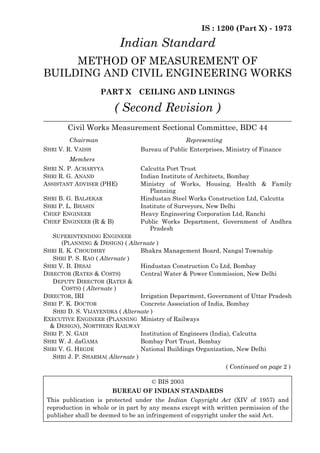 This document provides the Indian Standard method of measurement for ceiling and lining works in building and civil engineering projects. It outlines the general rules for measurement, including measuring dimensions to the nearest 0.01 m and areas to the nearest 0.01 m2. Various ceiling and lining items such as boarding, circular cutting, fillets, and insulation are to be measured separately according to specifications. No deductions are made for openings less than 0.4 m2 while deductions are made for larger openings.